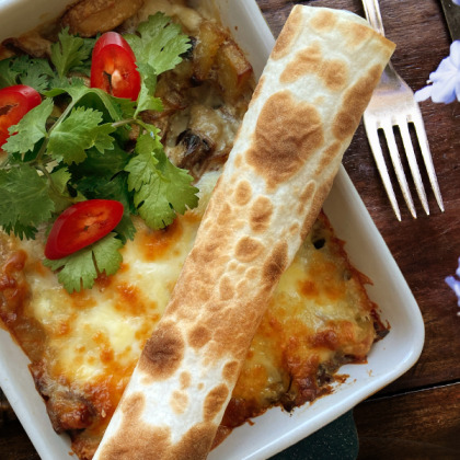 Говядина по-чкмерски с печеным с картофелем в грибном жульене под сыром