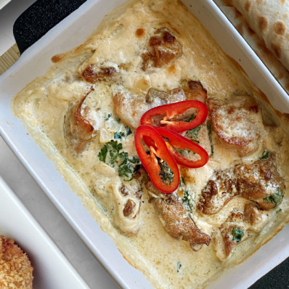 Сакварэли с запеченым цыпленком и грибами в сливочном соусе под сыром