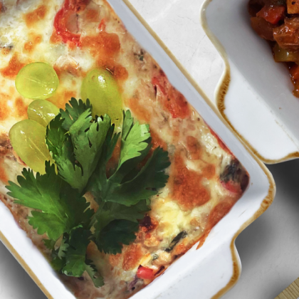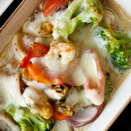 Соте из морепродуктов с брокколи и овощами , запеченное под сыром