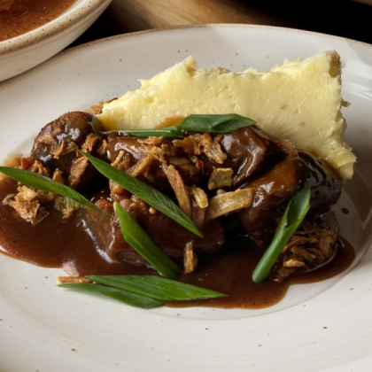 Телячий бок, томленый в гранатовом соусе демиглас с картофельным пюре