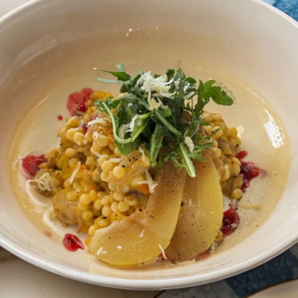 Рваная утка с пастой птитим, тыквой и печеной грушей