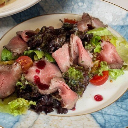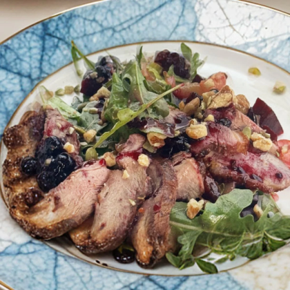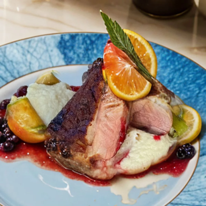 Утиная грудка с пюре из корня сельдерея и брусничным соусом