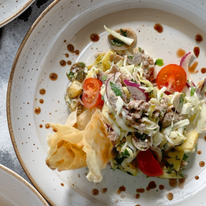 Салат с томленой свеклой, апельсином и сырным муссом в ореховом соусе