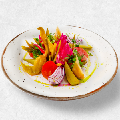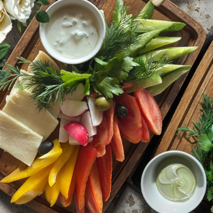 Ассорти сезонных овощей с домашним сыром и соусом дзадзыки