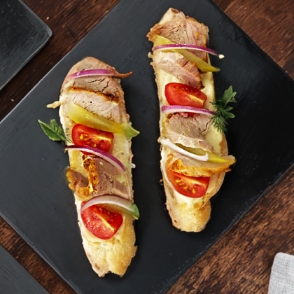 Брускетта С БУЖЕНИНОЙ, МАЛОСОЛЬНЫМ ОГУРЧИКОМ И МЕДОВО-ГОРЧИЧНЫМ СОУСОМ